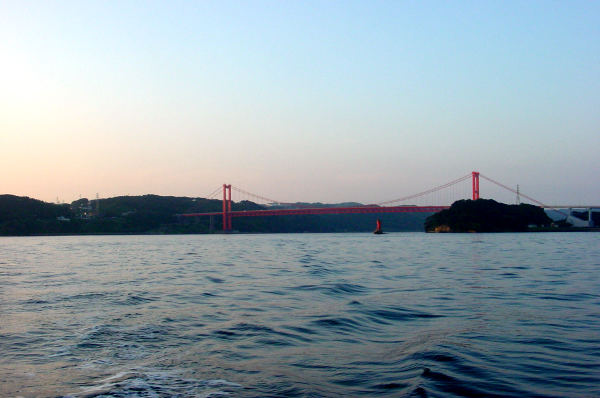 夜明け直後の平戸大橋。東の空が赤い。西(右側)が平戸港。