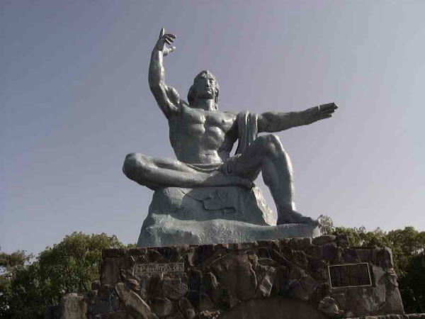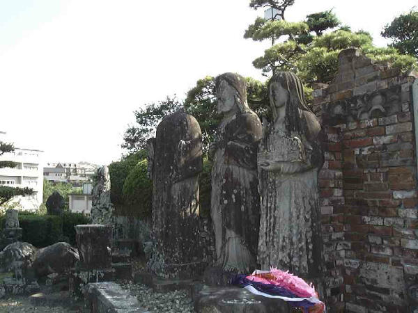 浦上天主堂の前にある聖人の像はいくつかが原爆によって