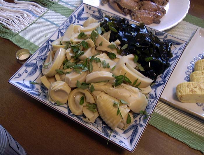 歌華人は若竹煮、小芋と豚肉の煮付け、木の芽和え、熊本の芥子レンコン