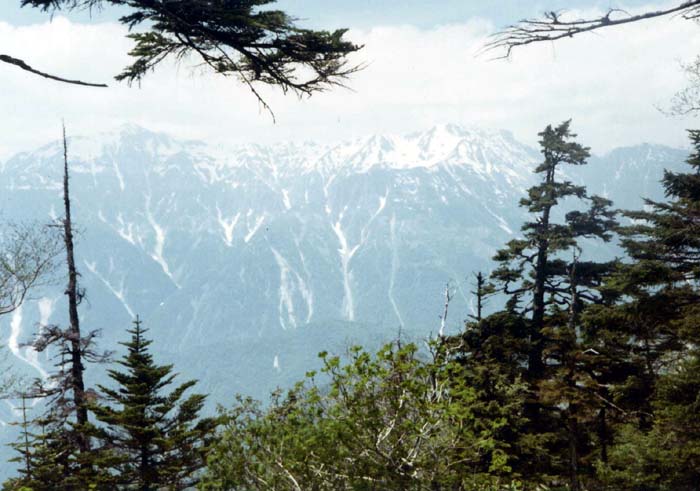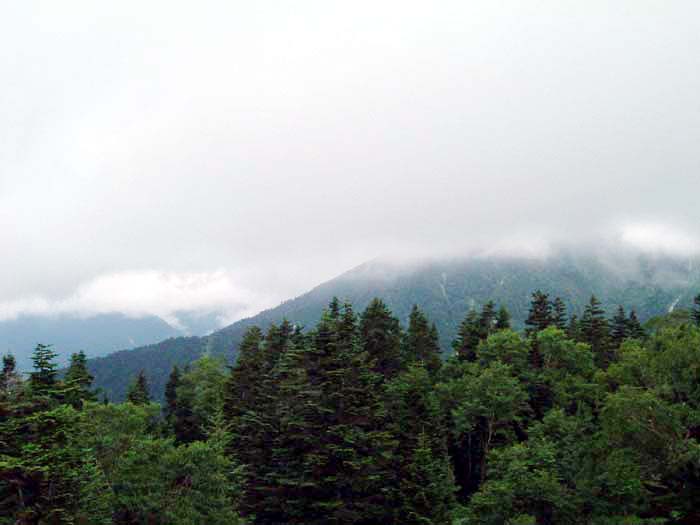 時折見える雲の切れ間からの北アルプス。こちらに槍ヶ岳が見えるはず。