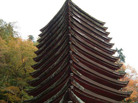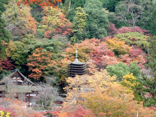 特に美しいのは、十三重の塔を谷を隔てて見る遠景です。