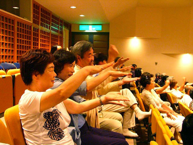 舞台の先生の動きに合わせて、皆、手をかざします。