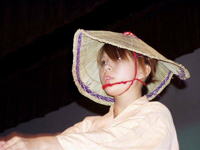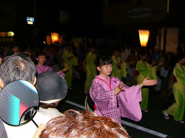 女性の踊り手の顔は笠に隠れて普通は見えないのだが、はなママさんが、舞台のかぶりつきからアップで撮影。