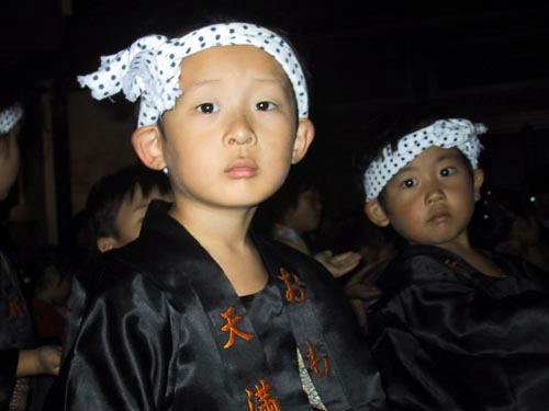 その後、まだ笠を背中にかけたままの少し年長の子供達がやってきます。