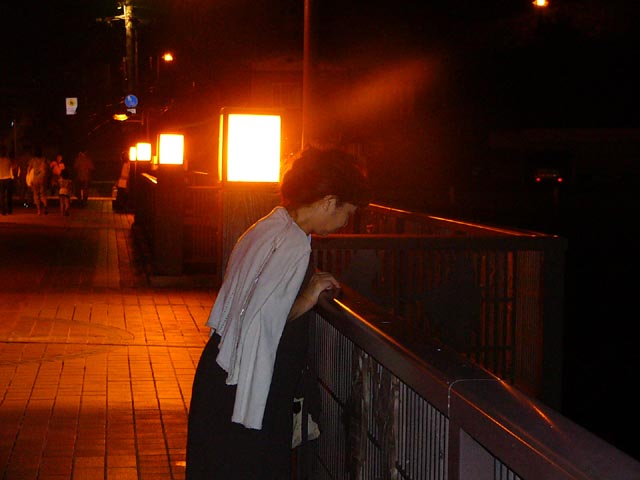 町流しを見た後、町の入り口の川に架かる橋まで散策。ネオンサインなど無い町に行灯のライトアップが美しく