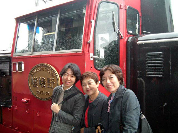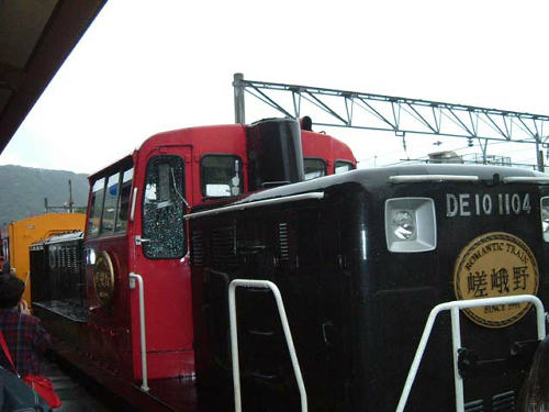 小雨降る中、トロッコ列車「嵯峨野号」に乗り込みます。
