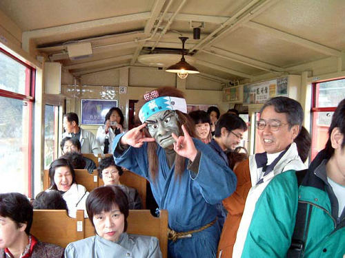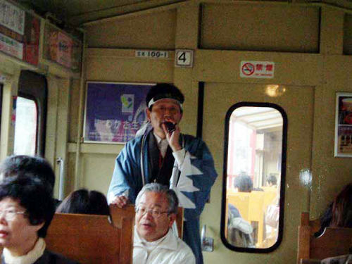 ガイドは新撰組の衣装を着けた面白いおじさん。乗り合わせているという台湾からの団体客の為に