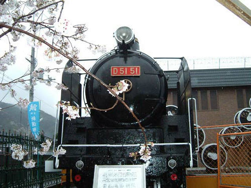 トロッコ列車の嵯峨野駅前にある「デゴイチ」と桜。
