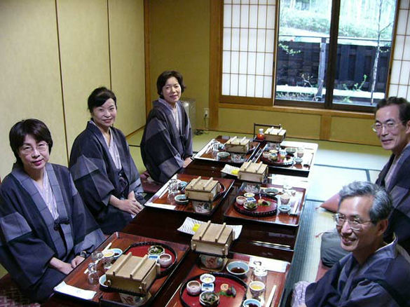 温泉を堪能した後は、楽しみな夕食。みんなの顔がほころんでいますね。