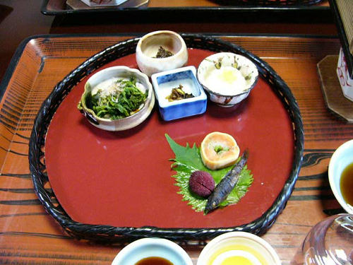 まずは、山菜や岩魚、ヤマモモ、蜂の子、岩魚の卵などの前菜。