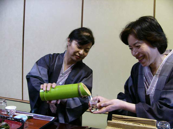 竹筒から注いでいるのは地酒。女二人でさしつさされつ・・・