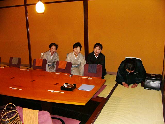 な・な・なんと、女性陣は皆さん、着物姿。しかも三つ指突いて我々をお出迎え。