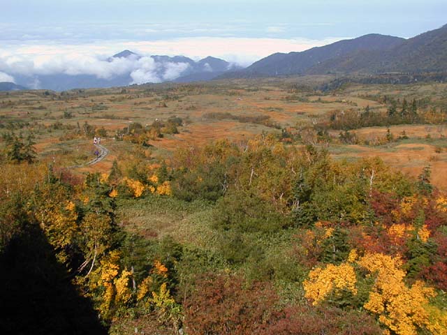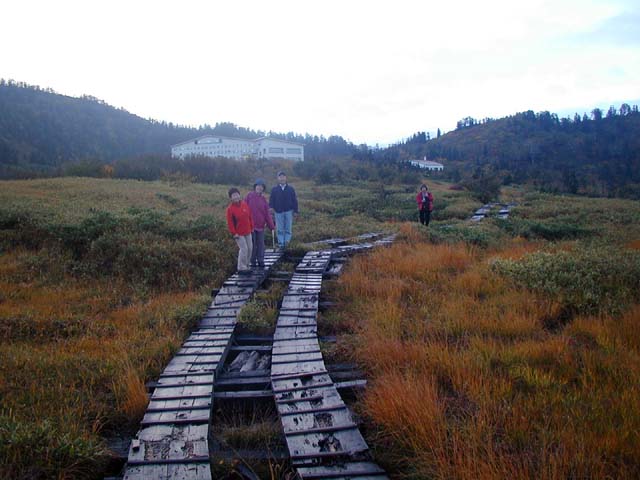弥陀ヶ原の散策はこのような木の小径をたどります。決して、小径からはずれて、周囲の環境を損なってはいけません。