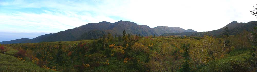 これは大日連山のパノラマ写真です。左から標高2498mの大日岳、中大日岳、2606mの奥大日岳です。