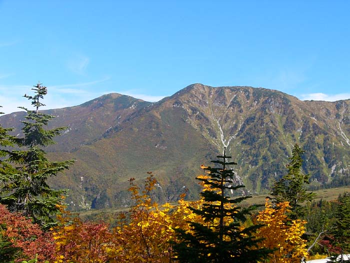 おおしらびその林から見る大日岳。山肌が紅葉しているのがよくわかります。