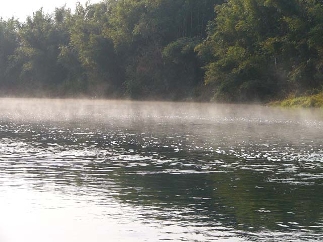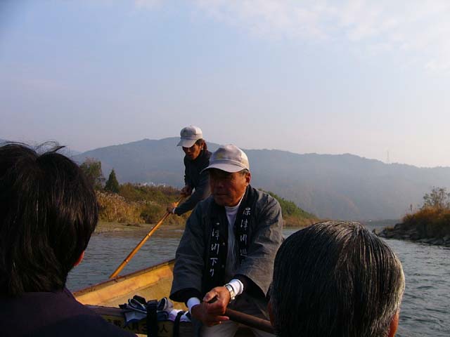 朝9時、好天の中を出発です。乗り組む船頭さんは三人、前に二人、後ろに一人で、前の二人が竿と櫂を使い、