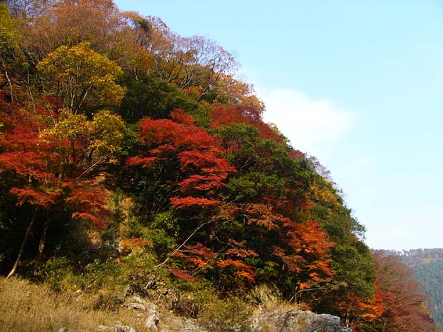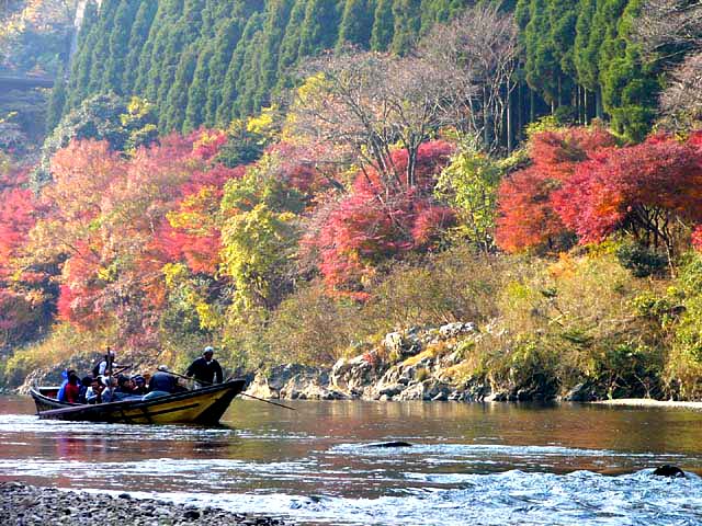 川から見る周囲の景色は、見事な紅葉。それでも船頭さんに言わせれば「今年はもひとつですな」ということです。