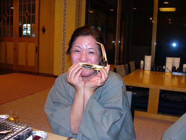 メインディッシュその1は焼ガニ。緑のタグは間人蟹の証明で、船の名前が書いてあるのだ。