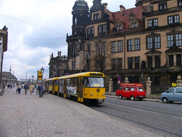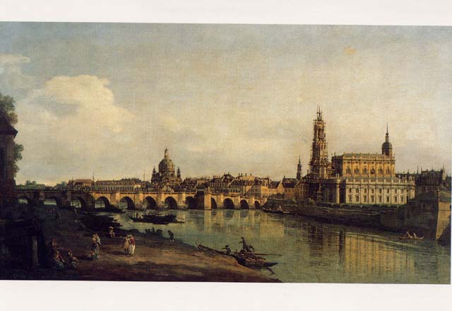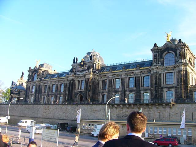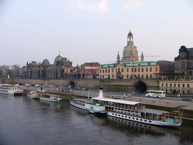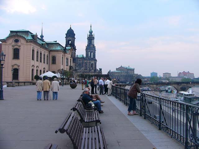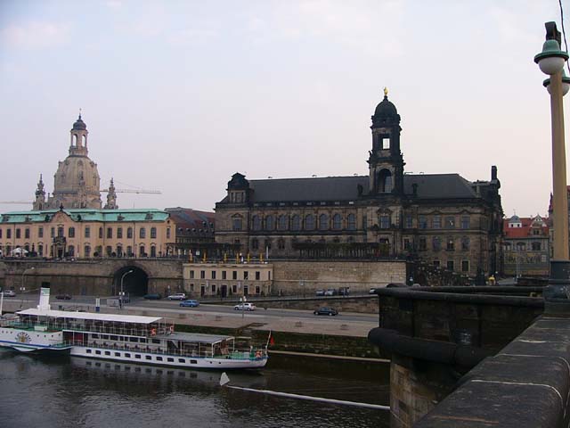右にエルベ川、正面に宮廷教会ホーフキルヒェとゼンパーオペラ劇場が見えます。