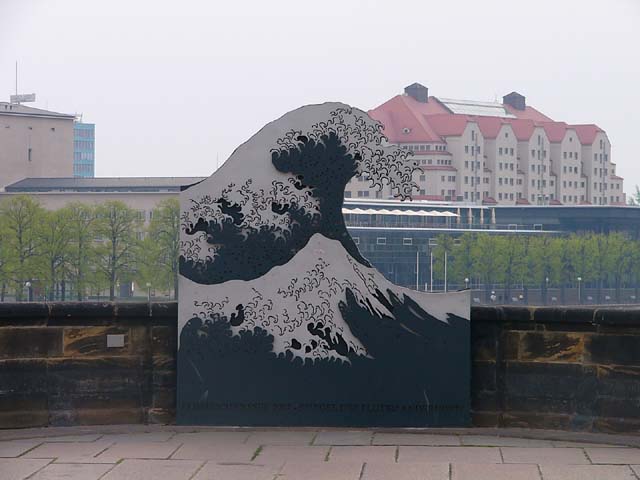 な、な、なんと、なぜか橋の半ばには、北斎の富岳三十六景の一部を切り出した看板があるではありませんか?