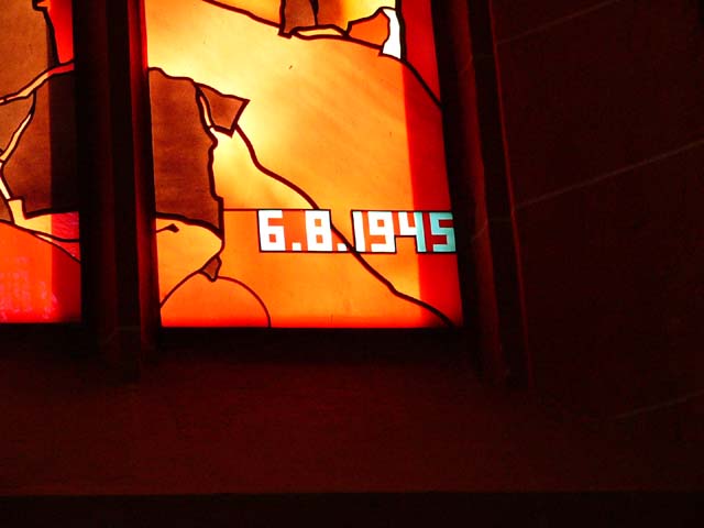 そして、入り口近くにある右手前のステンドグラスには人類初の核被爆である広島を忘れない