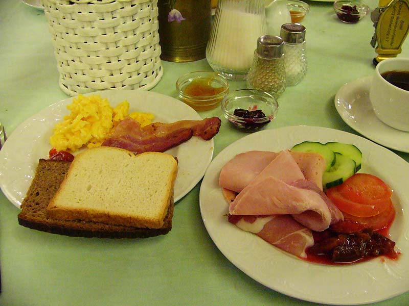 朝食はやっぱりハムとソーセージと黒パンです。 ハムは種類が豊富で大変旨い。