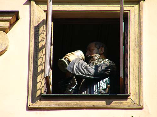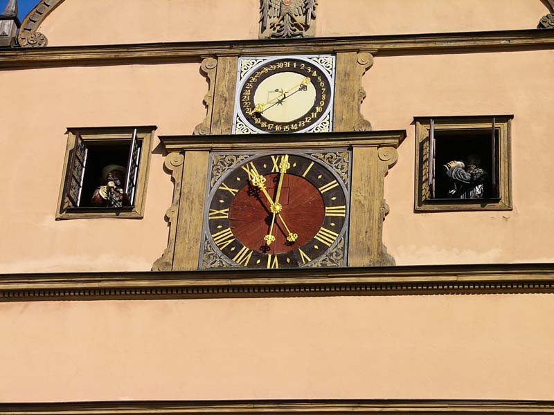 時計は仕掛け時計で、11時から丁度の時刻に窓が開いて「マイスター・トゥルンク」という伝説(30年戦争当時、市長が