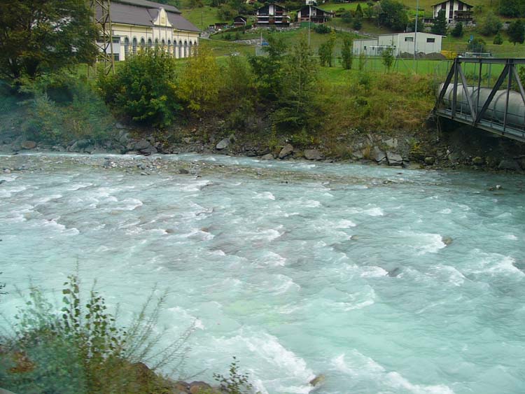 ツェルマットに近づくと氷河から流れる川がこのように白濁しています。これは氷河によって山の石灰岩が削ら