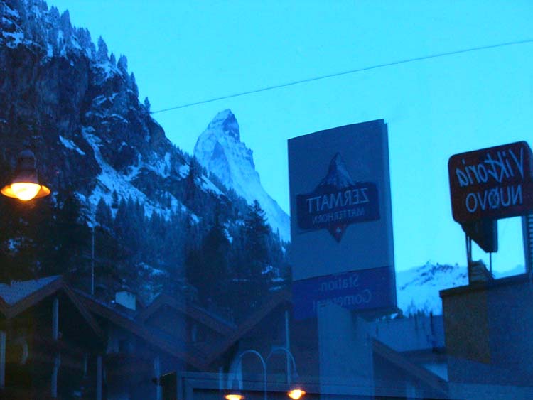 ん? 建物のガラスに映った左右反転マッターホルンです。