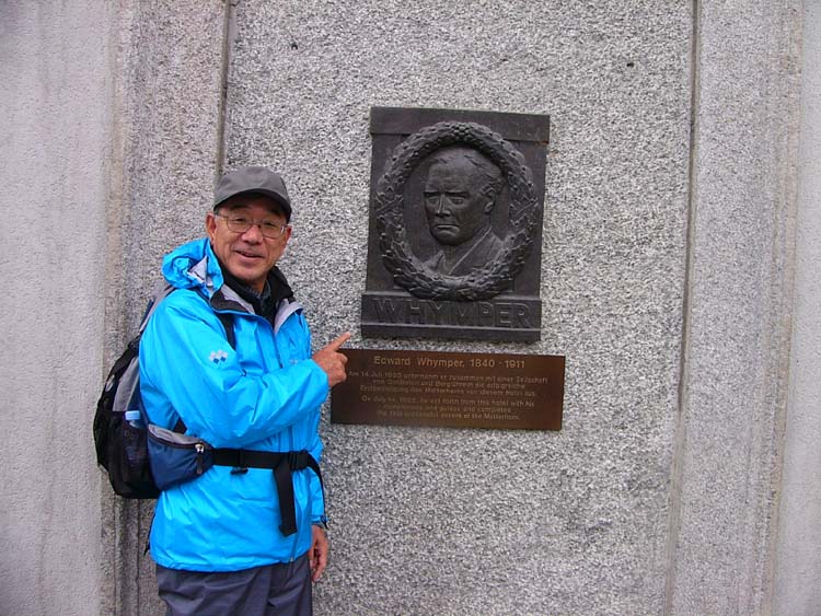 ホテルへ戻る道すがら、ホテル・モンテローザの壁にあるウィンパーのレリーフの前で