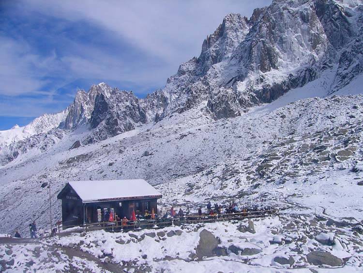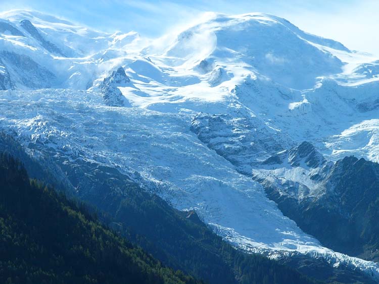 レストランから見るモンブランと氷河、モンブランは左側の峰です。