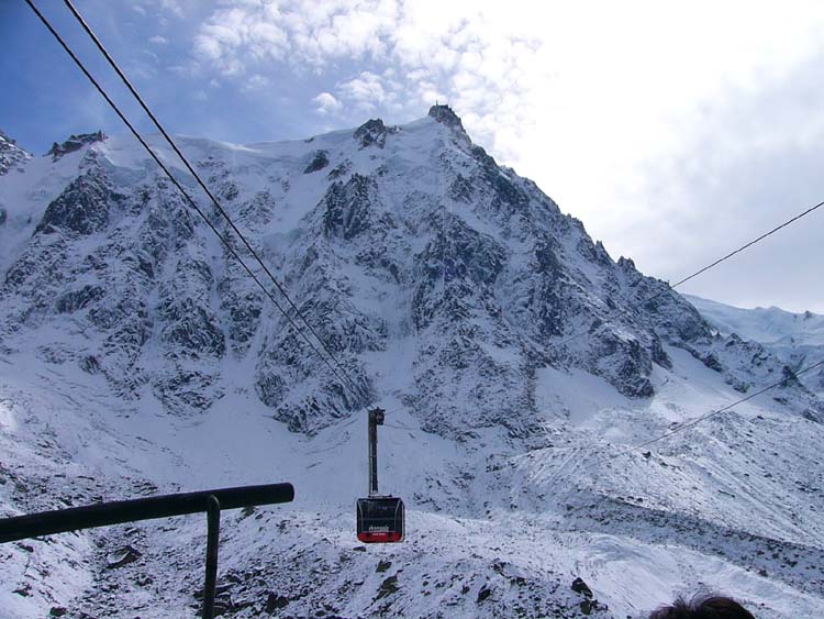 これから、このロープウェーで、3842mのエギーユ・デュ・ミディ展望台に上ります。途中、中間駅で乗り