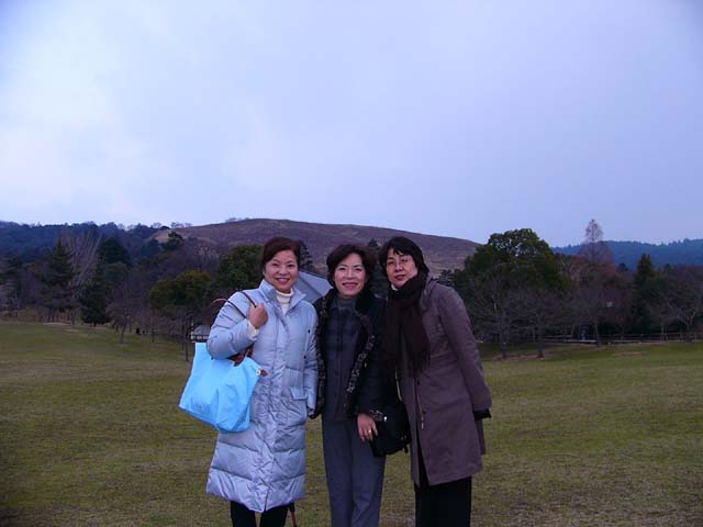 ここは新奈良公会堂と東大寺の間に広がる広大な芝生。鹿のふんを踏みしめ、若草山をバックに。