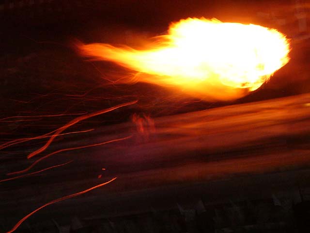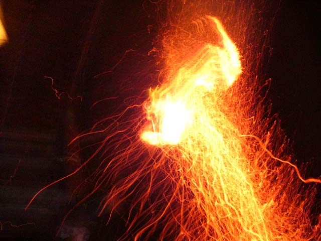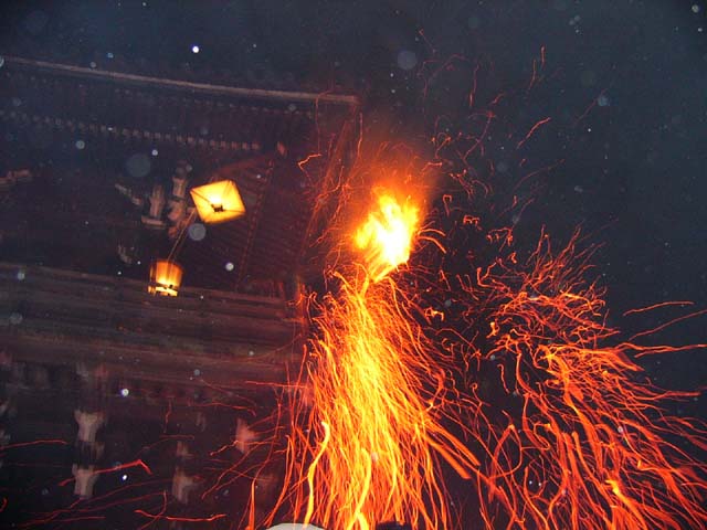 午後7時、鐘の音と共に境内の明かりが消え、お水取りのクライマックス「お松明」が始まります。