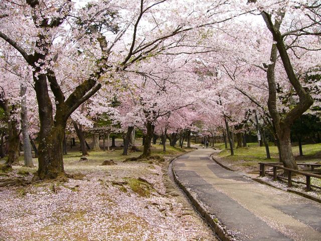 若草山の麓に向かう桜のトンネル、このあたりの桜はいろんな色が混じって、まっこと美しい。
