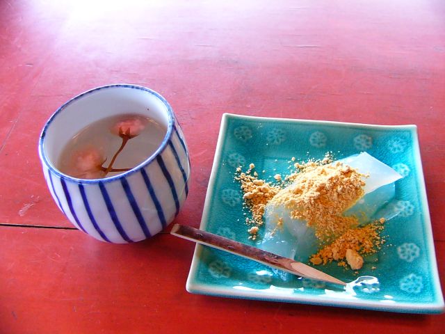 ここでのおもてなしは桜湯と吉野葛の葛切り。