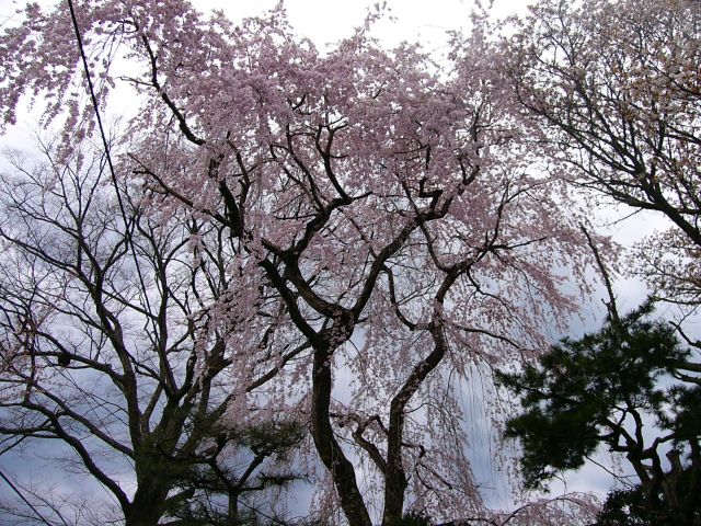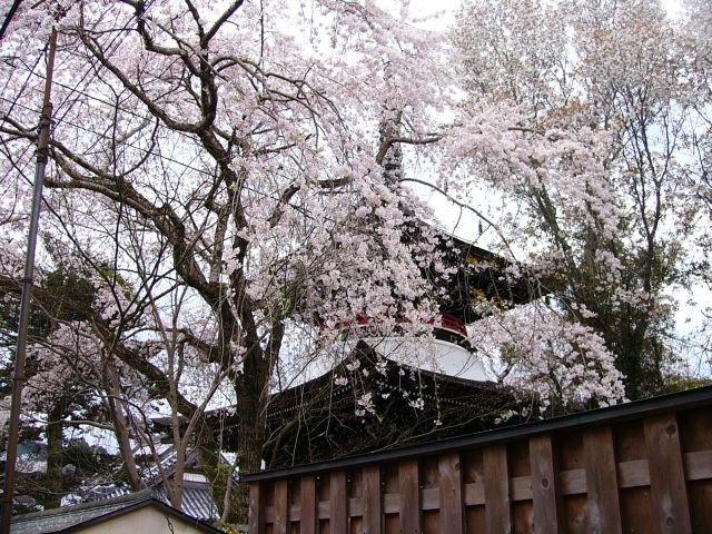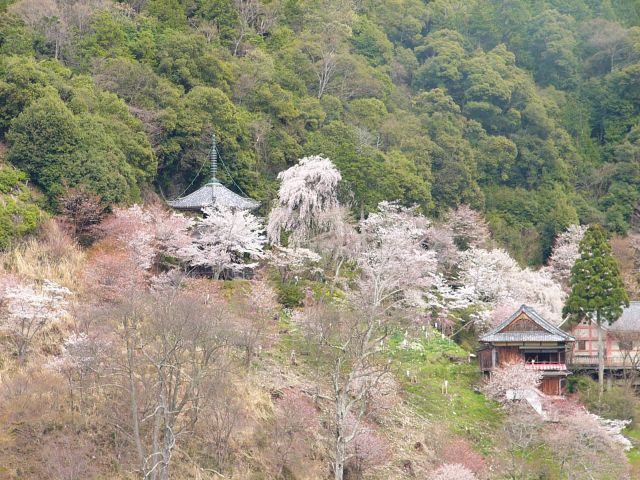 そして、谷の向こうには如意輪寺の塔と枝垂桜です。