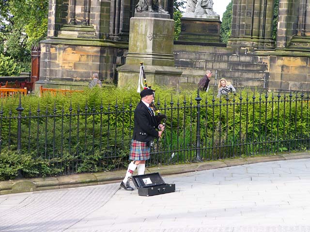 スコットランドの正装をしてバグパイプの演奏をする大道芸人