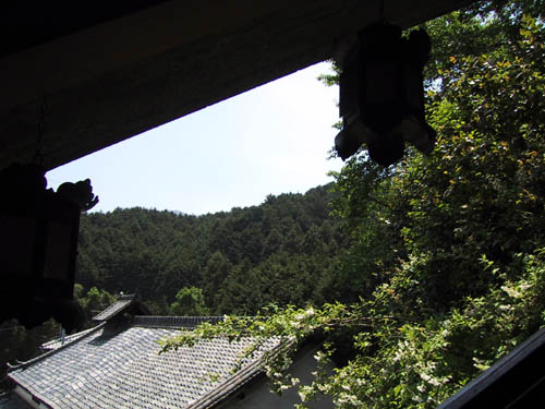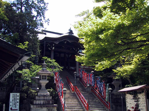 赤い橋を渡ると遥か山頂に樹木に囲まれた赤い本殿が見え隠れしています。