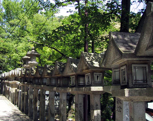 石灯籠がずらりと並んだ参道をぬけると,舞台作りの本堂があらわれました。