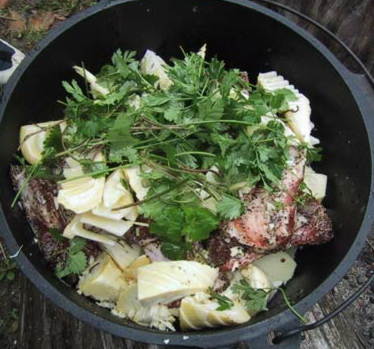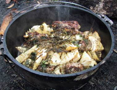 まずダッチオーブンを使って、スペアリブと筍の煮込み、上にあしらってるのは芹