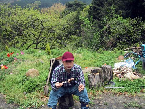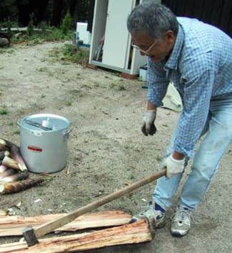 残りの筍をすぐに茹でるため薪を割る大津君