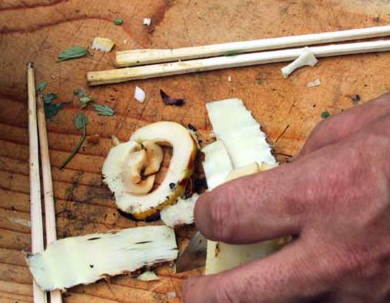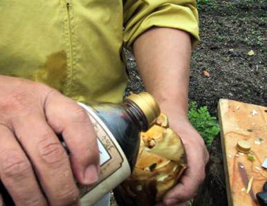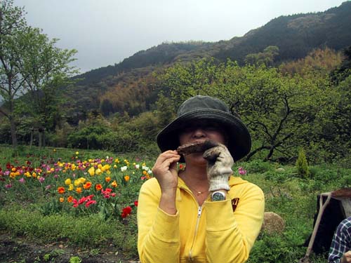 焼き筍は、真ん中に穴を開けて、お醤油をたらしこみ、そのまま焚き火に入れておきます。