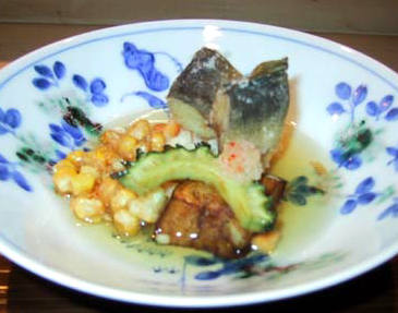 玉蜀黍 にがうりなど揚げて薄味の餡がかけてあります。
