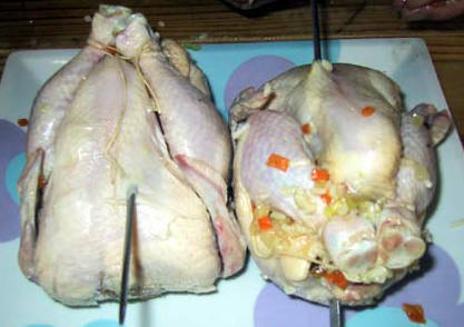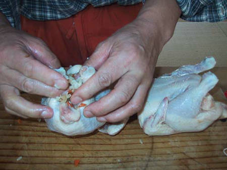 バターライスを鶏のお腹につめる