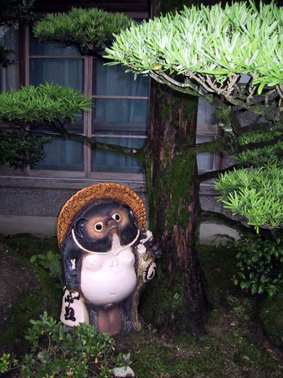 玄関の前で酒瓶をぶら下げた狸がお出迎え