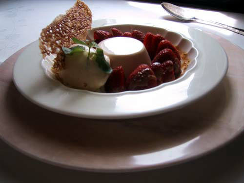 ミルクのブラマンジュとレモンバーム入りのアイスと熟れて実のしまった苺