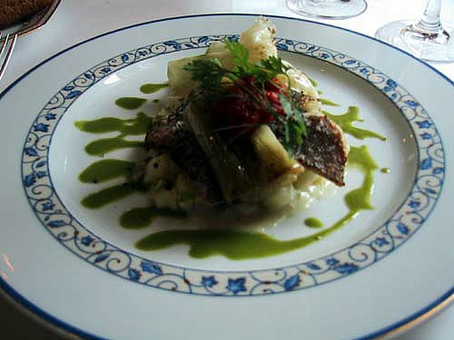 鯛とイサキのケッパーソース 香ばしいソテーに岩塩をきかせてソースの緑が美しい