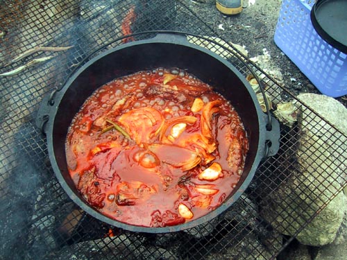最初に塊のまま焚き火であぶって余分の油を落とします。