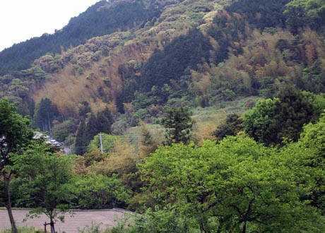 途中の山々は新芽を吹いてパッチワークみたいです。